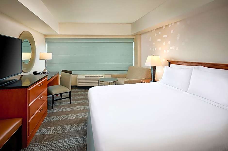 This suite offers a separate bedroom, seating area with modern furniture, a 37-inch satellite TV, and views of the city.